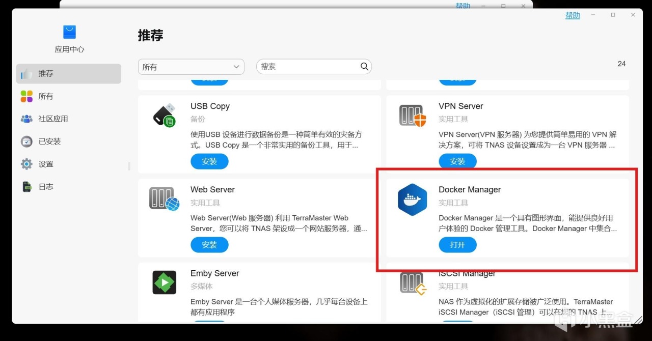 接着需要安装Docker。在“应用中心”找到“Docker Manager”,点击“安装”(图中已经安装好了)。静候几分钟,Docker安装成功后,就可以开始下一步了。