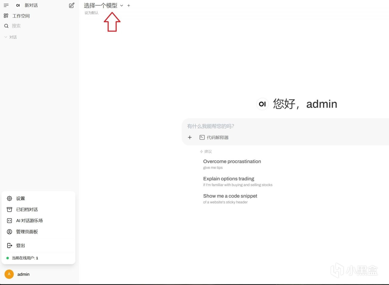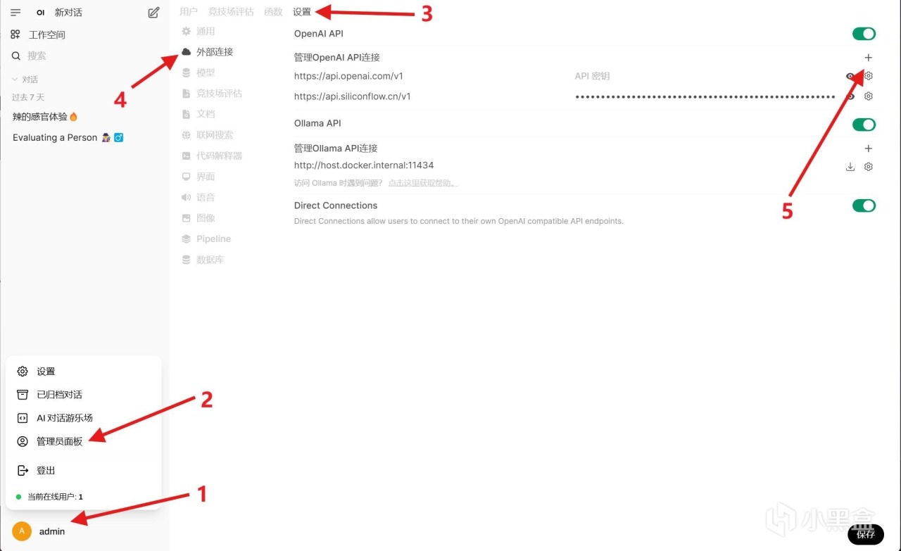 进入页面后,如图依次点击,打开“管理员面板”后,找到“设置”里面的“外部连接”,添加我们所需要的API。如果没有如图所示界面,点一下左上角“选择一个模型旁”那个类似于省略号的图标即可。