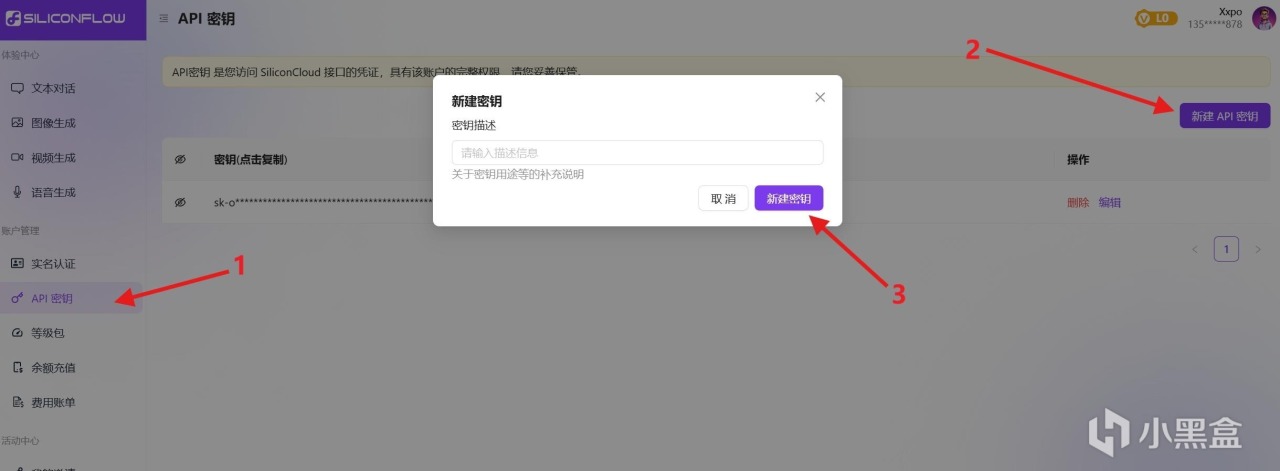 划重点01——这里我们需要先申请一个API Key,因为后面要用到。如图所示即可新建密钥了,密钥一般都是sk开头的。