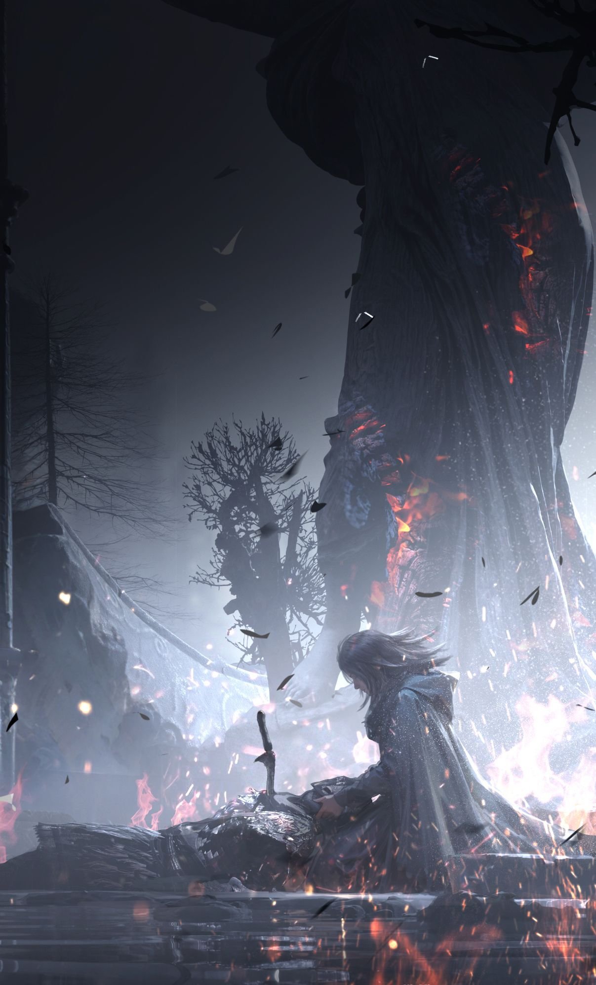 她伸出粗糙、佈滿疤痕的雙手,汲取了這足以焚燬黃金樹的火焰,自己身上也燃起熊熊大火。