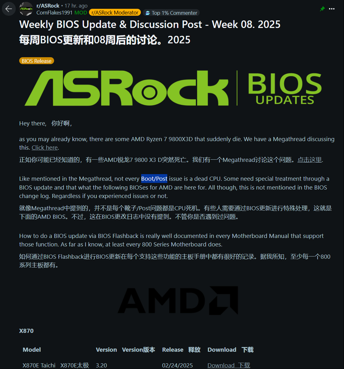 據稱 AMD 和華擎都知道這個問題,但 AMD 尚未發表官方聲明。可能是未確定根本原因,或者未和華擎形成共識?而華擎則是在今天發佈了 X870E、X870 主板的 BIOS更新,並建議遇到 啓動/Post 問題的用戶更新。如何解決死機、崩潰問題則未提及。