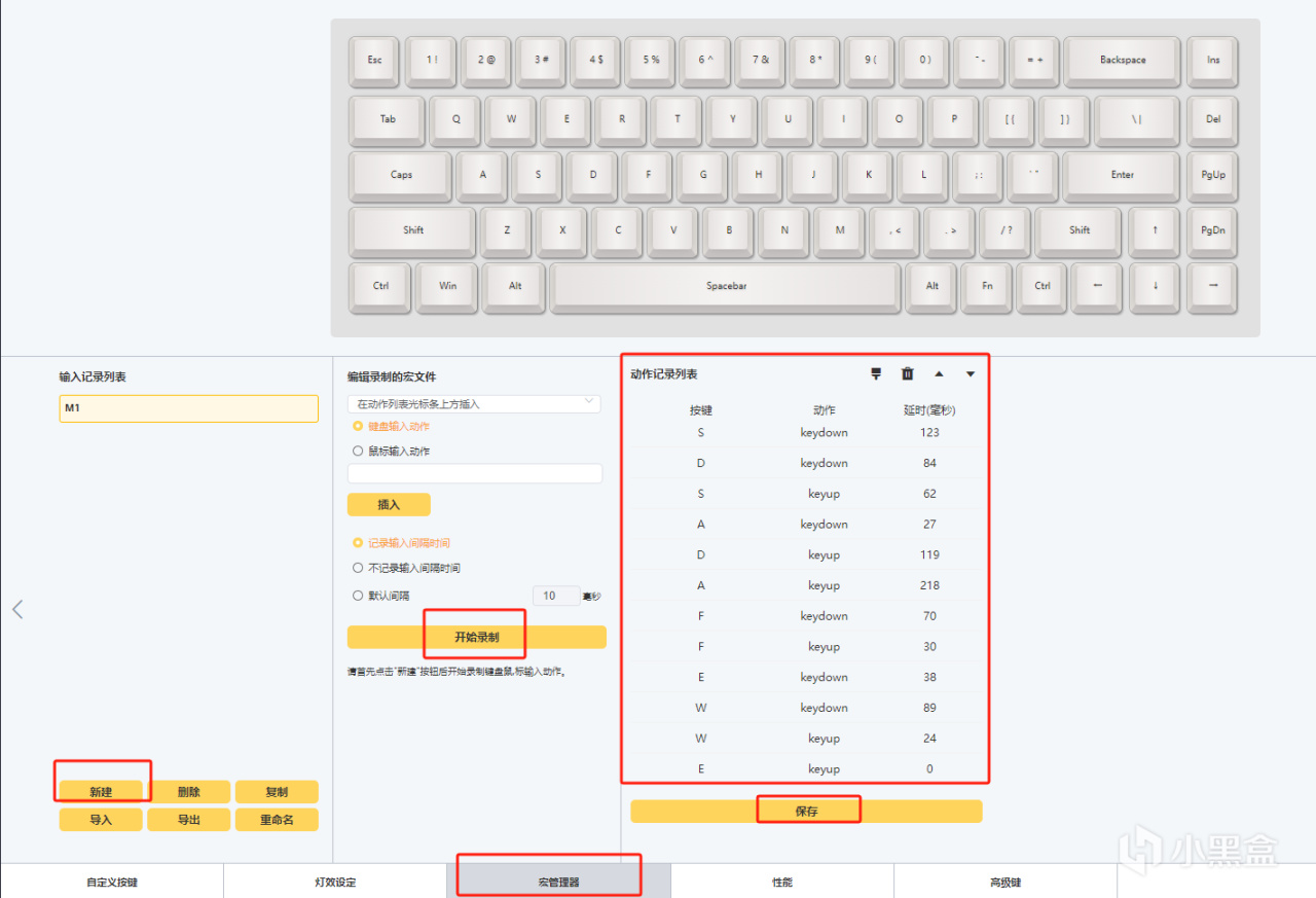 输入记录列表:新建、删除、复制、导入、导出、重命名等功能(注:如果键盘设置了宏则不给删除)