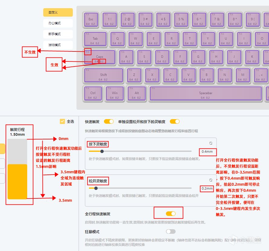 当开启全行程快速触发时,设置的行程将会失效,按键的按下与否只与按键按下和松开的灵敏度有关。