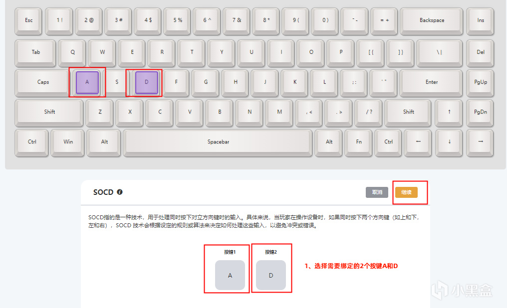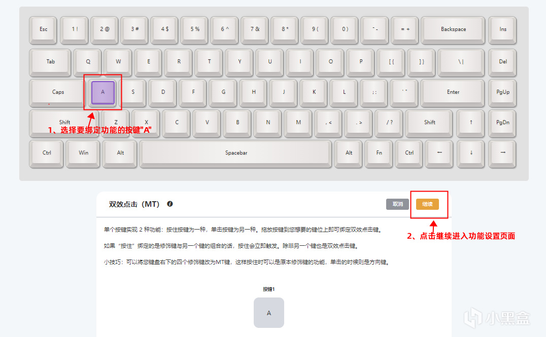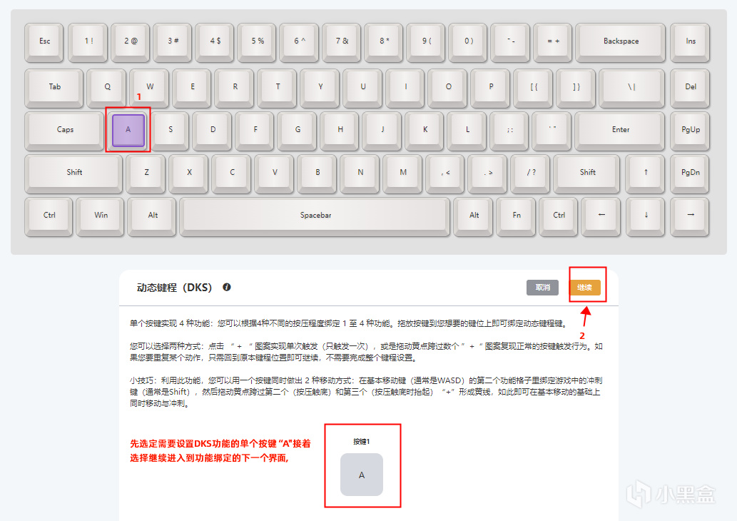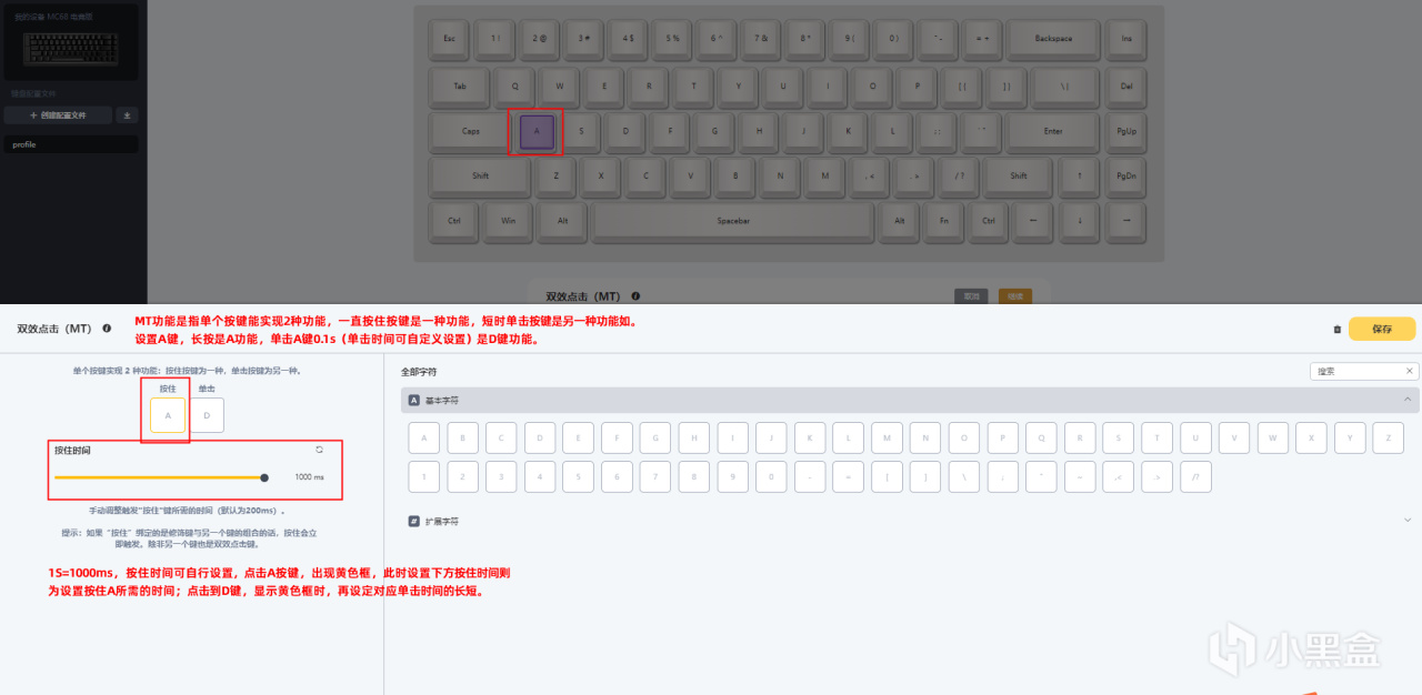 如设置A按键,单击A按键是A功能,长按A按键是D功能。