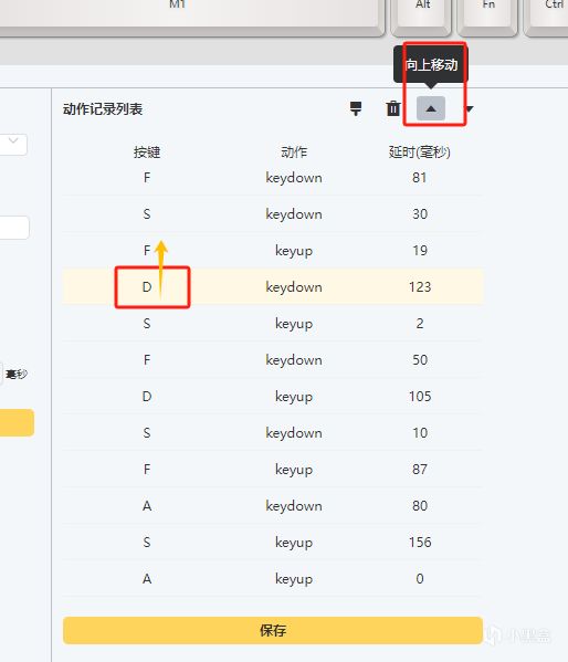记录录制的按键,支持清空、删除、向上移动、向下移动等操作。