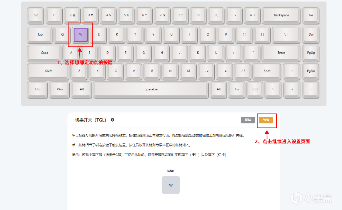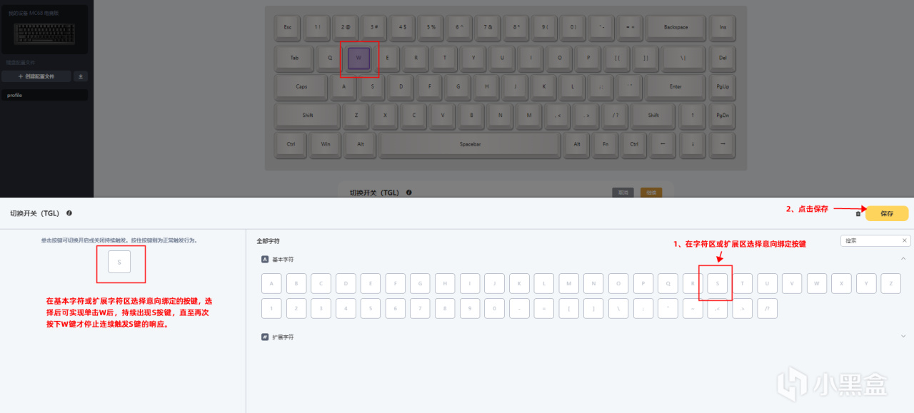 如按一下W键,键盘会一直持续输出S键对应的功能,直到用户再次按下W键才能停止信号继续发送。