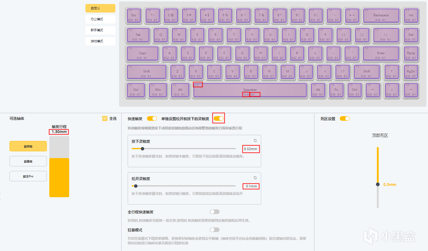 当开启快速触发时,未开启全行程快速触发,按键会在到达指定行程(如上图设置1.3mm)后触发。