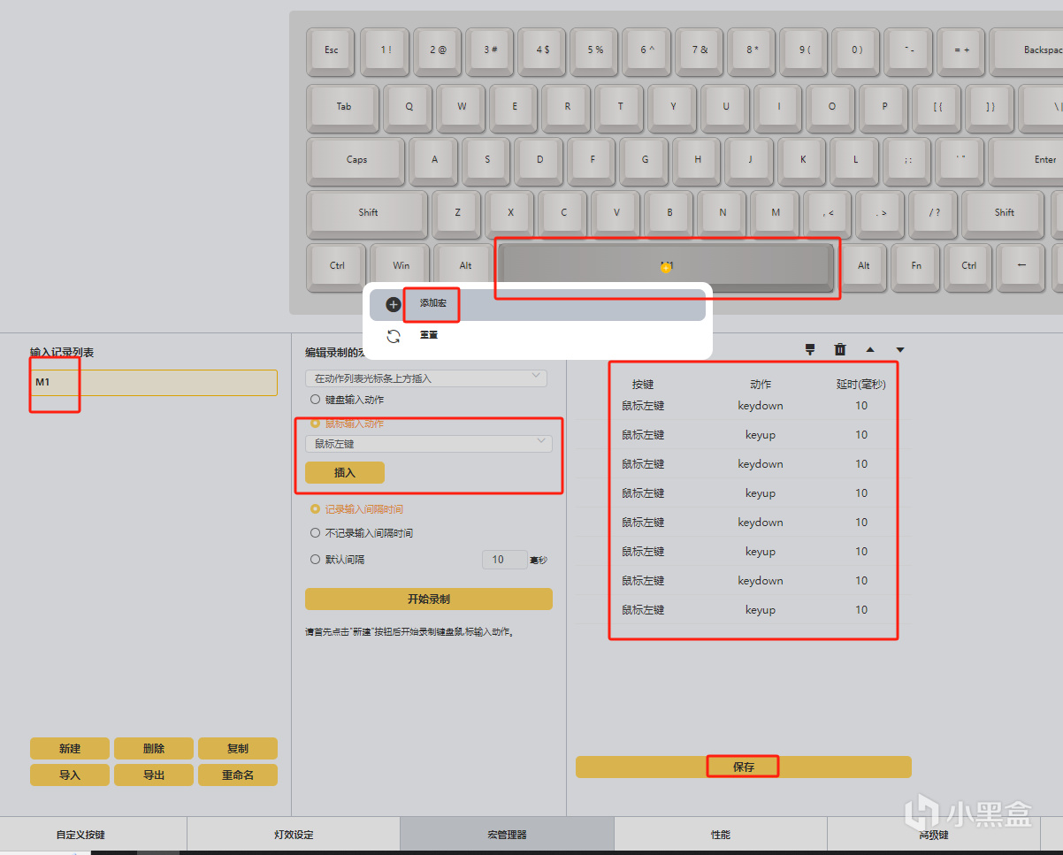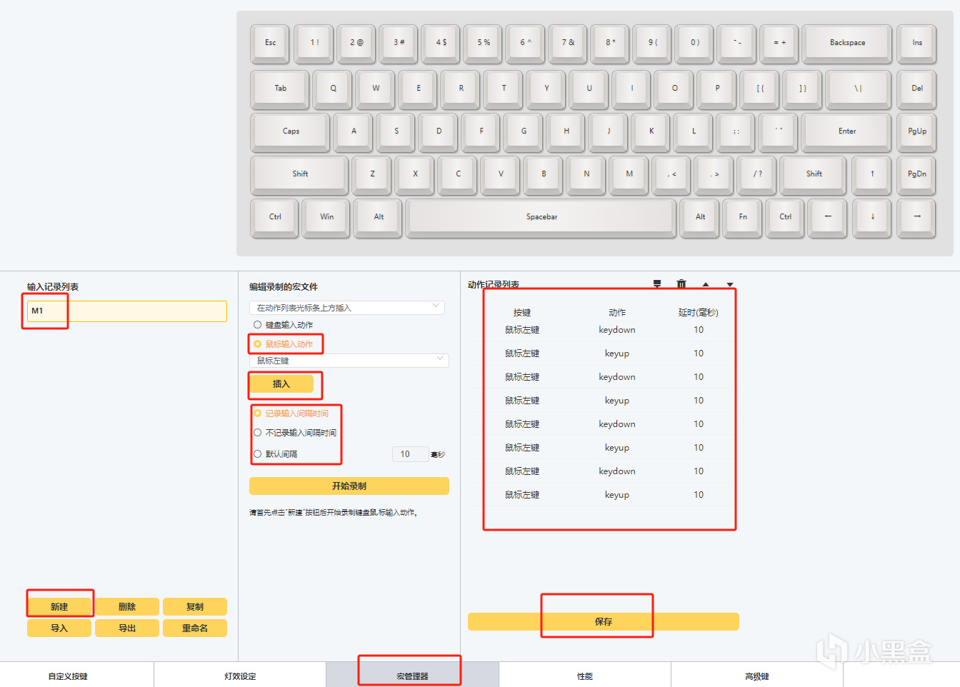 支持插入方向,鼠标输入动作,单选记录时间隔时间和不记录输入间隔时间,将设置好的宏添加入按键中,让自定义按键实现宏功能。