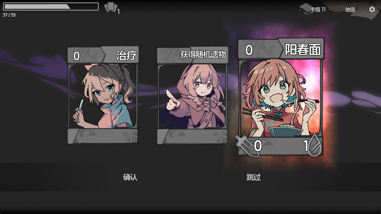 肉鸽牌组构建类游戏,充满手绘动画风格的各色卡图