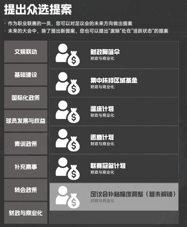 再看看我自己,游戏里给出的可选议案众多,从最基本的财政规划、转会政策、青训政策,到相对边缘一点的文娱联动,可谓是应有尽有。