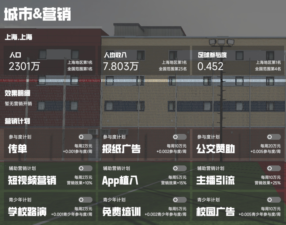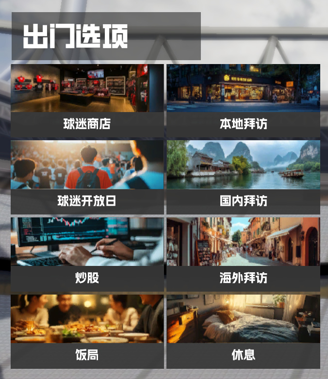 每周在进行完常规的球队运营操作后,游戏还存在“出门”功能,你可以举办球迷开放日,吸引更多的球迷;拜访其他城市的俱乐部经理,交流心得;买卖股票,为自己的球队积攒更多经费。