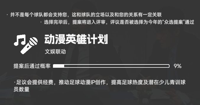 只不过“有人的地方就有江湖”,初出茅庐,毫无成绩的球队经理,天生就人微言轻,我所有提案的通过率几乎都在15%以下,像上图那个“动漫英雄计划”,只有9%的通过概率。