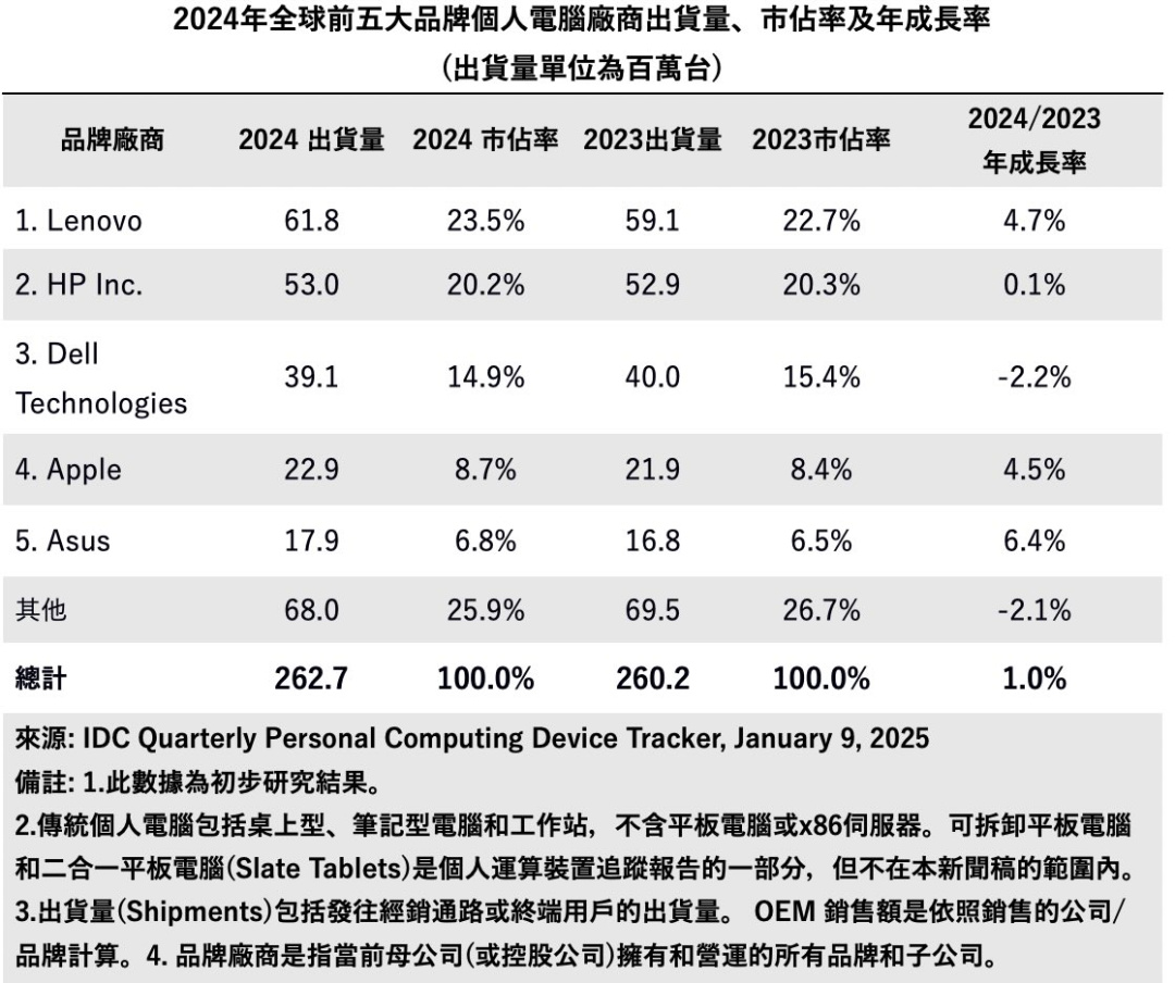 跟前面手機和平板市場有所不同,2024 年全球 PC 市場,還是由聯想、惠普、戴爾等老牌廠商佔據主導地位。