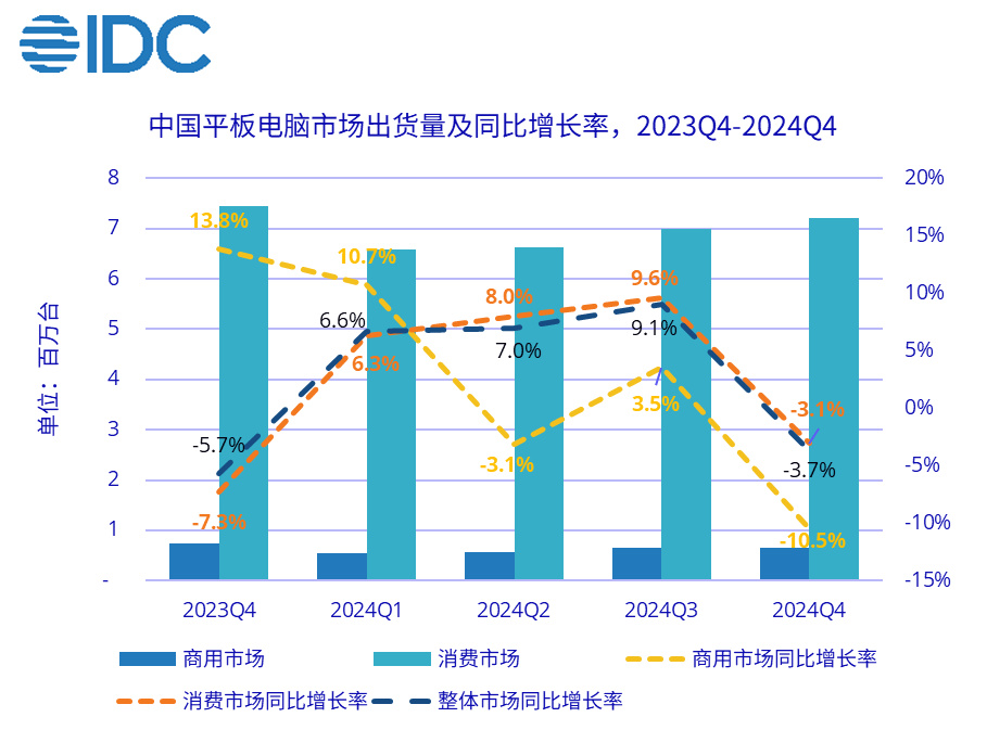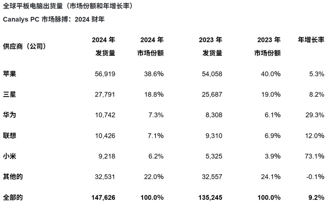 與此同時,2024 年中國平板出貨量爲 2985 萬臺,同比增長 4.3%,國內平板電腦出貨量 TOP 5 分別是華爲、蘋果、小米、榮耀以及聯想,其中除了蘋果份額同比下跌,其他幾家或多或少都迎來了上漲。