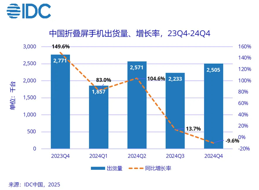 2024 年全球摺疊屏出貨量在 1830-2000 萬臺區間,其中國內市場將近佔了一半,出貨量爲 917 萬臺,同比增長 30.8%,但增速較前幾年有着明顯放緩,第四季度更是首次出現同比下降 9.6% 的情況。