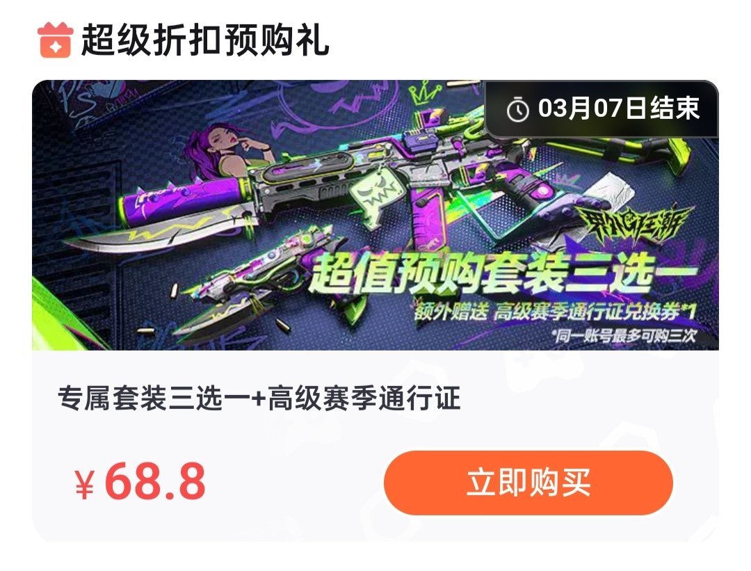 7、#小程序://網易會員/wwjt1AzKsENVaXg(複製到微信打開),可提前折扣預購——三選一套裝+高級賽季通行證(截止3月7日)