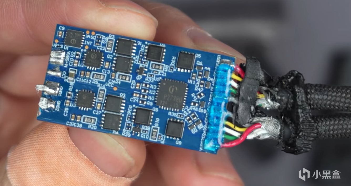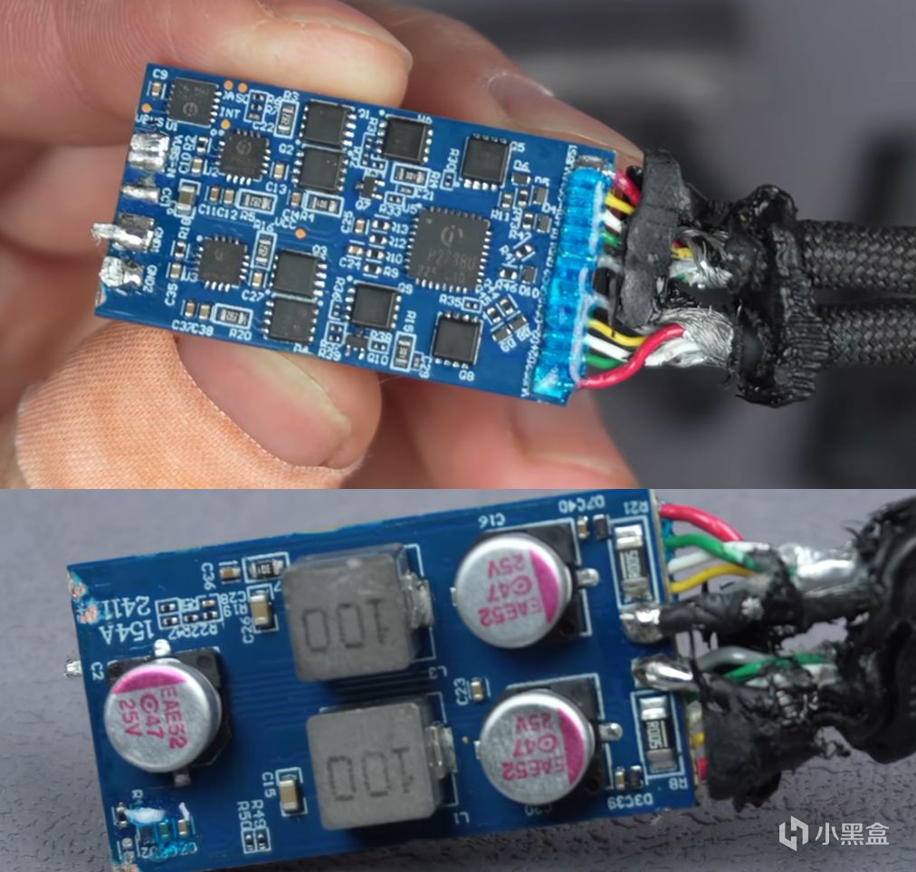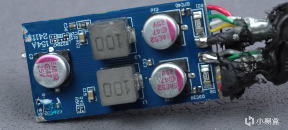 拆解圖顯而易見,一拖二爲紮實的兩路升降壓電路,可以做到70W+30W功率分配,也可OUT 1單路100W,比一般的一拖二充電線可玩性高太多了!