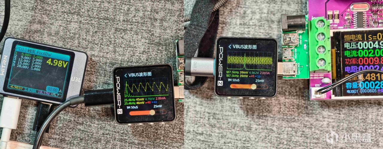 實測在5V 2A檔位下,能將紋波由45mV降至39mV,這款充電器性能較好,區別不大,後續有空得用小新的頭子測試一番。