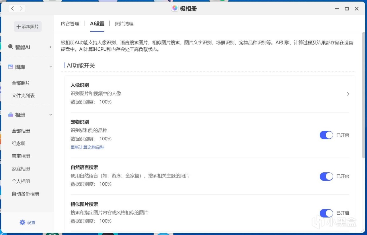 要在極相冊中啓用AI識別功能,你需先進入設置頁面,開啓所有與AI相關的選項,並下載AI引擎以增強識別能力。之後,你就可以利用AI技術,在衆多的照片庫中輕鬆搜索到特定的圖片,無論是身份證、發票,或者一些風景照片或者動物,只需輸入關鍵詞,即可快速找到。