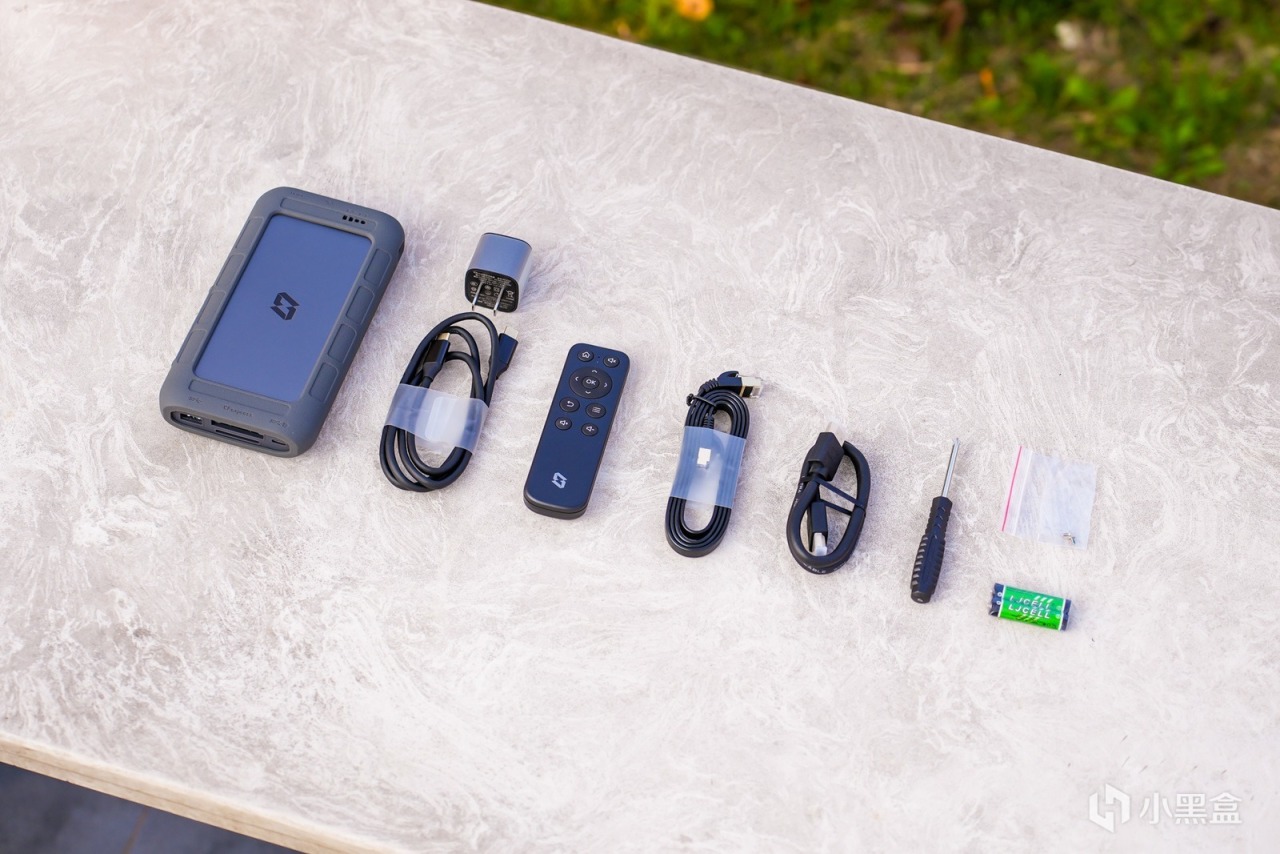 極空間T2S配件數量很多,基本上爲了適配所有的場景,什麼都給你了!包括遙控器、電源適配器、網線、HDMI線、雙頭Type-C線、螺絲刀、硅膠套、使用手冊、保修卡、配件包等,以上這些配件都可以裝進附贈的收納包裏面,隨身攜帶。