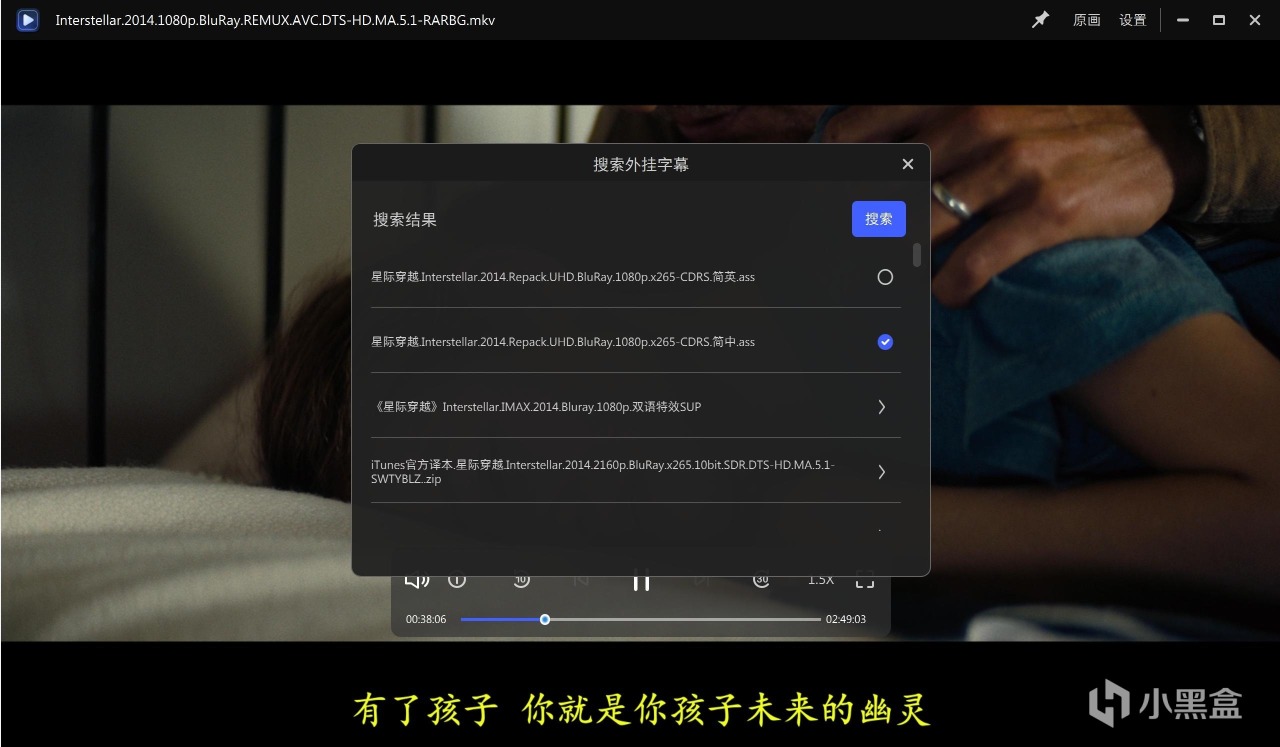 新版本字幕匹配功能也更加智能,比如我下載的這部《星際穿越》是不帶中文字幕的,但是隻要點擊搜索,它就能夠根據電影名字輕鬆匹配到影片的字幕文件,無需擔心字幕不匹配的問題。
