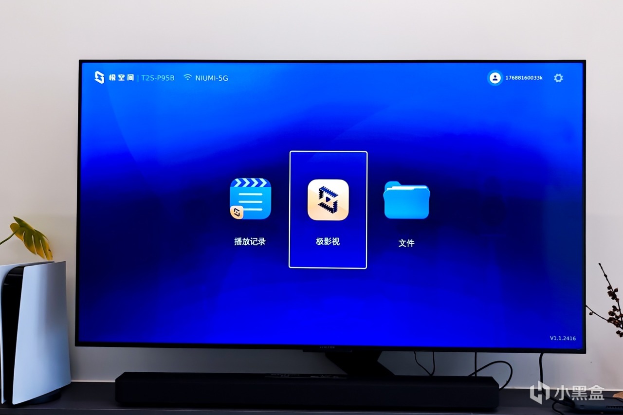 T2S這時候無需網絡、無需APP,它內置了一個TV端的極空間OS,只需要將電視、顯示屏或投影儀等設備通過HDMI線連接到T2S上,可看到電視上的系統是這樣的。