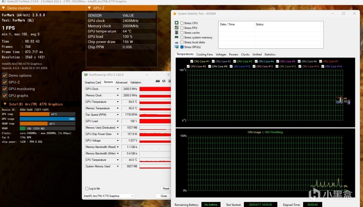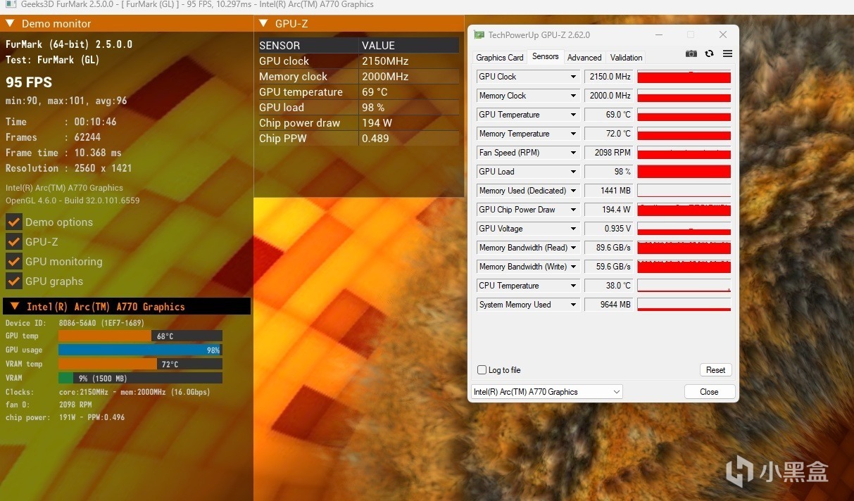 藍戟A770 Photon 16G的GPU clock對應頻率是2150MHz,功率也達到了最大的194 W。在十分鐘的壓力測試過程中,兩款顯卡的頻率一直很穩定,沒有什麼太大的波動,不過此時顯卡溫度有些差異,藍戟B570 Photon 10GB對應溫度爲64攝氏度,功率略高的藍戟A770 Photon 16G對應溫度爲69攝氏度。