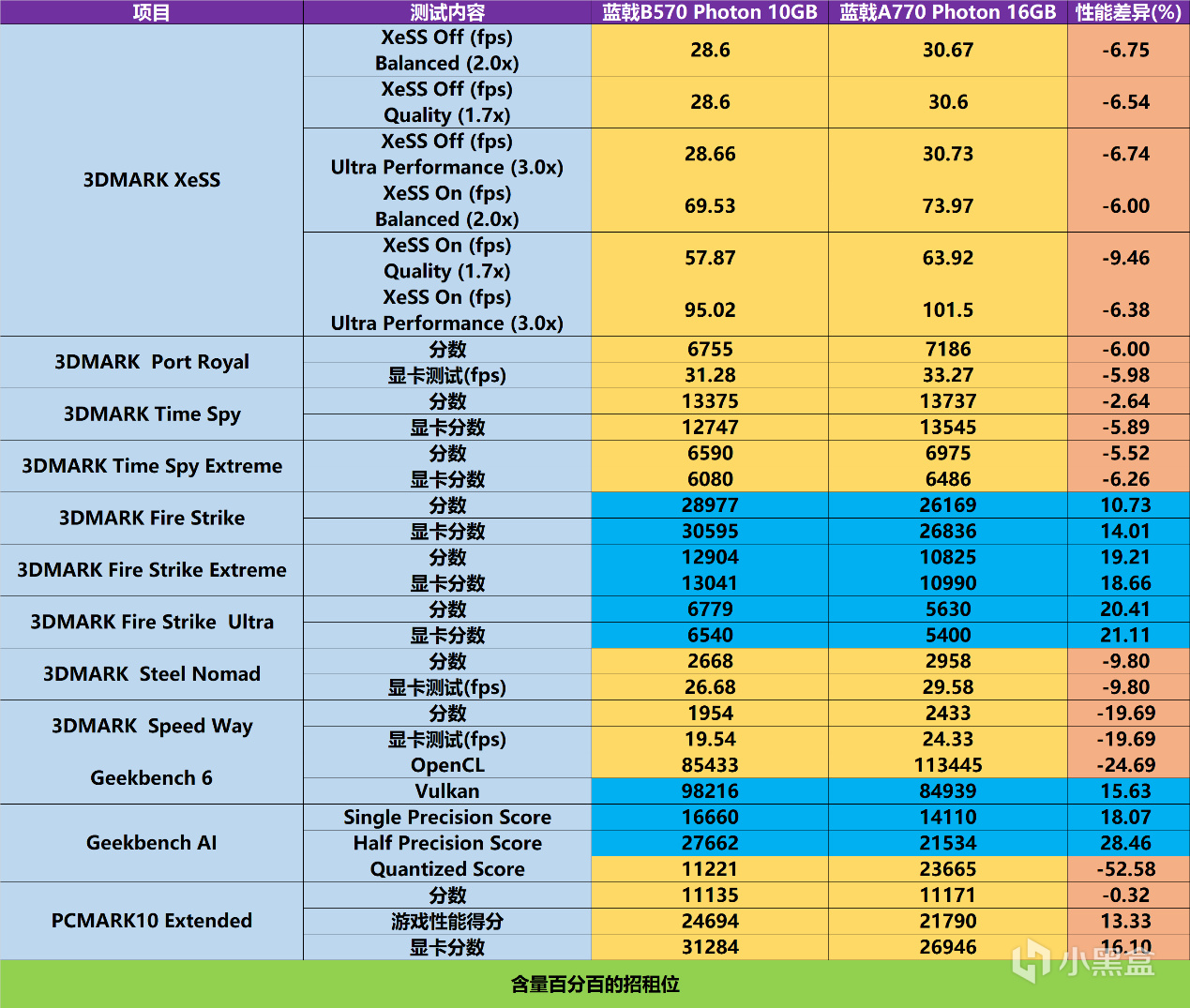 下面我在顯卡默認模式下對顯卡做一些性能測試、遊戲測試以及生產力相關的測試。我們先來看看兩款顯卡搭配幾款軟件進行基準測試的對比結果,性能差異的部分使用藍戟B570 Photon 10GB對比藍戟A770 Photon 16G。