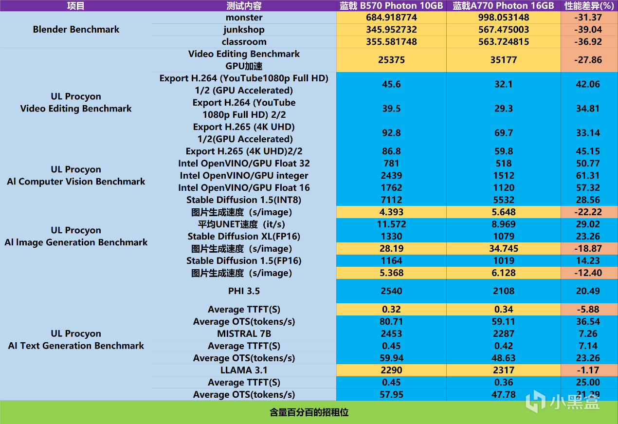 內容創作和AI相關的部分 ,我這裏搭配了Blender和UL Procyon軟件進行測試。藍戟B570 Photon 10GB在Blender下的測試結果不及藍戟A770 Photon 16G,不過在UL Procyon相關測試下的絕大部分成績要優於藍戟A770 Photon 16G,包括視頻導出、AI內容創作方面。