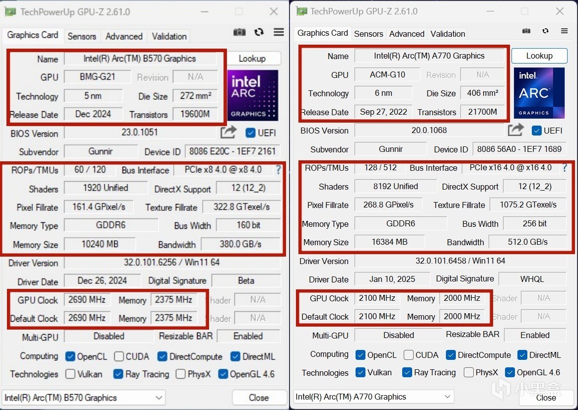 就硬件規格來看,藍戟B570 Photon 10GB配備18個Xe2核心、18個光追單元,藍戟A770 Photon 16G配備了32個Xe內核、32個光線追蹤單元。藍戟B570 Photo 10GB搭載的是160-bit位寬的GDDR6顯存,顯存帶寬爲380GB/s,藍戟A770 Photon 16G搭載的是256bit位寬的GDDR6顯存,顯存帶寬爲512GB/s;藍戟B570 Photo 10GB默認基礎頻率爲2690MHz,而藍戟A770 Photon 16G默認基礎頻率爲2100MHz。