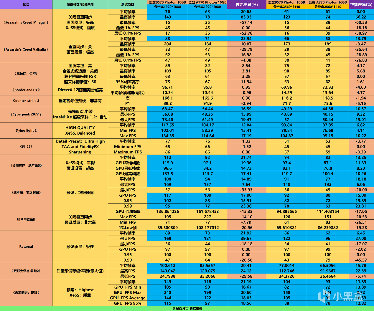 遊戲測試的部分,我這裏主要選擇了一些內置Benchmark的遊戲,分別在1080P和2K分辨率進行測試,部分遊戲有支持XeSS,但暫時沒有支持XeSS2的遊戲。從測試結果來看,頻率更高的藍戟B570 Photon 10GB和顯存更大的藍戟A770 Photon 16G打的是有來有回,但有一個共同點就是啓用XeSS的遊戲下,藍戟B570 Photon 10GB的成績要高於藍戟A770 Photon 16G,比如《Cyberpunk 2077 》、《極限競速:地平線5》、《古墓麗影:暗影》等。另外有點沒想到的是藍戟B570 Photon 10GB在《荒野大鏢客:救贖2》的平均幀率會比藍戟A770 Photon 16G高出10 fps以上。