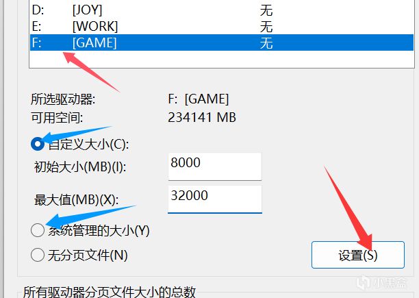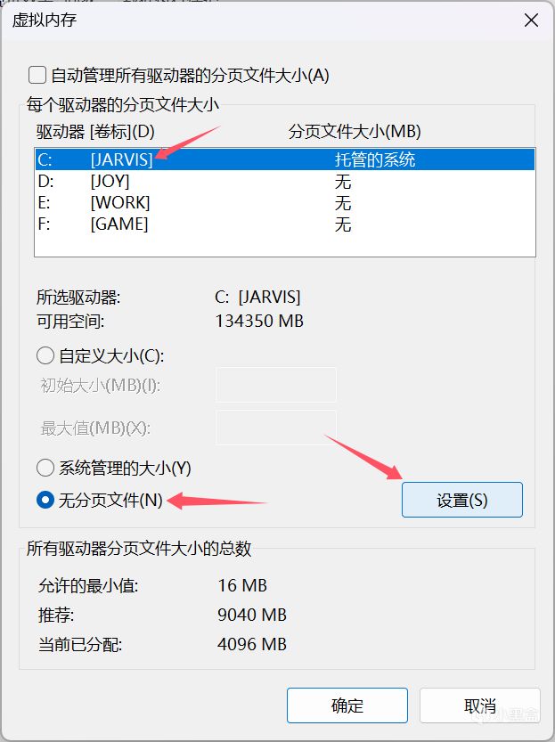 (如果選中C盤無分頁跳提示的話,可以先選中其他盤,設置完系統管理大小,再回選C盤設置無分頁)