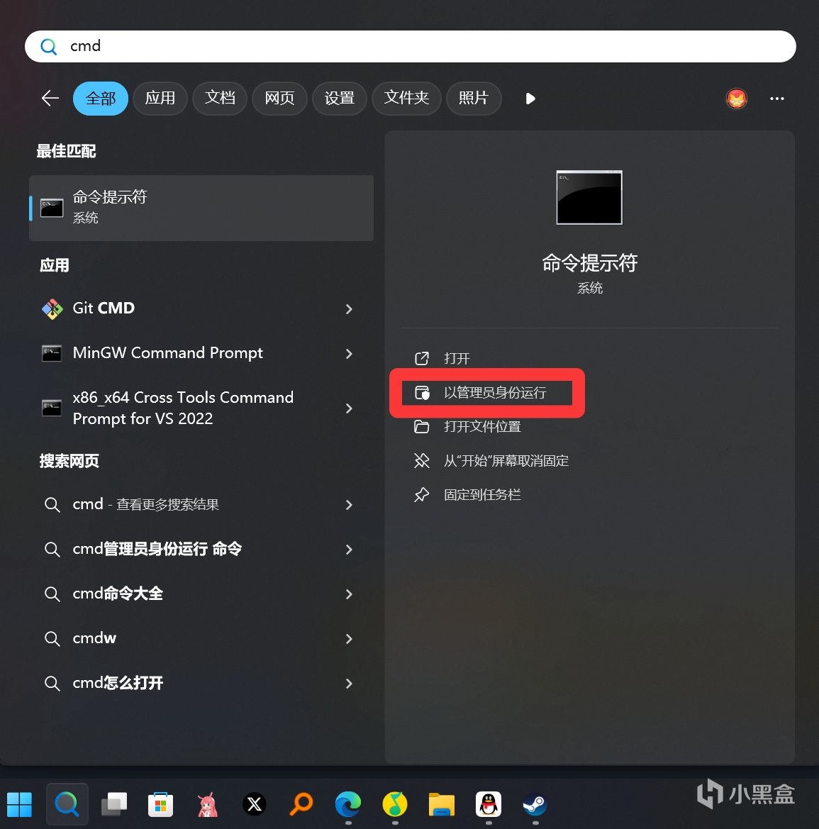 刪除休眠文件,如果需要該功能則忽略此條。先在電源管理內設置成“永不休眠”,然後在系統搜索欄裏搜索cmd,右鍵管理員模式打開,輸入powercfg -h off回車,刪除休眠文件。