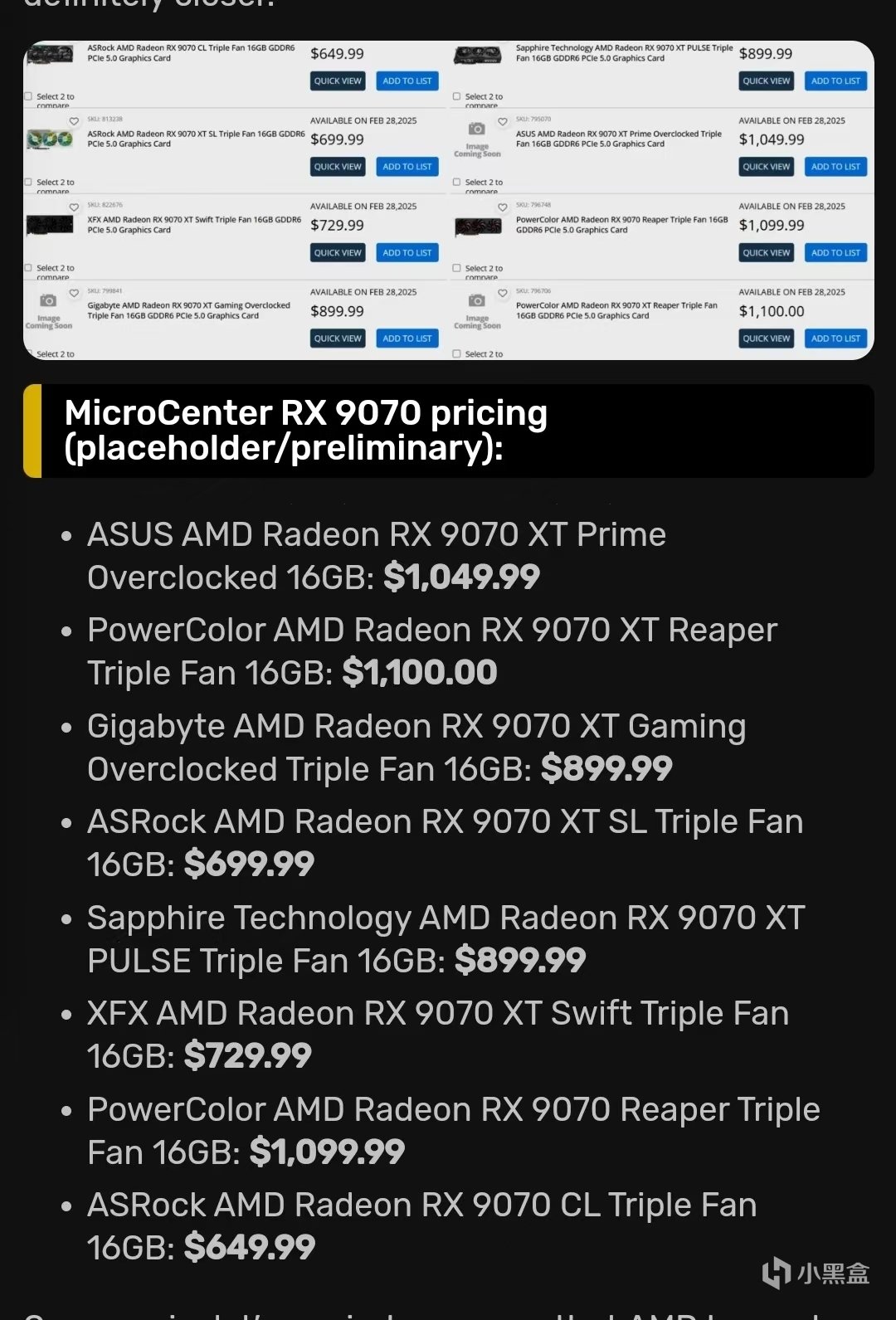 在价格上,micro center列出RX 9070起售价649美元,RX9070XT起售价699美元。