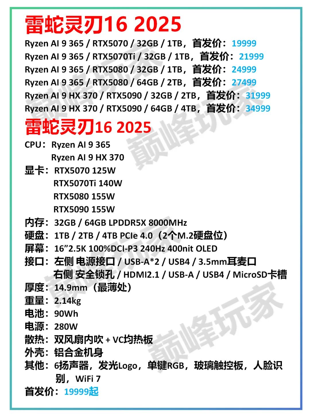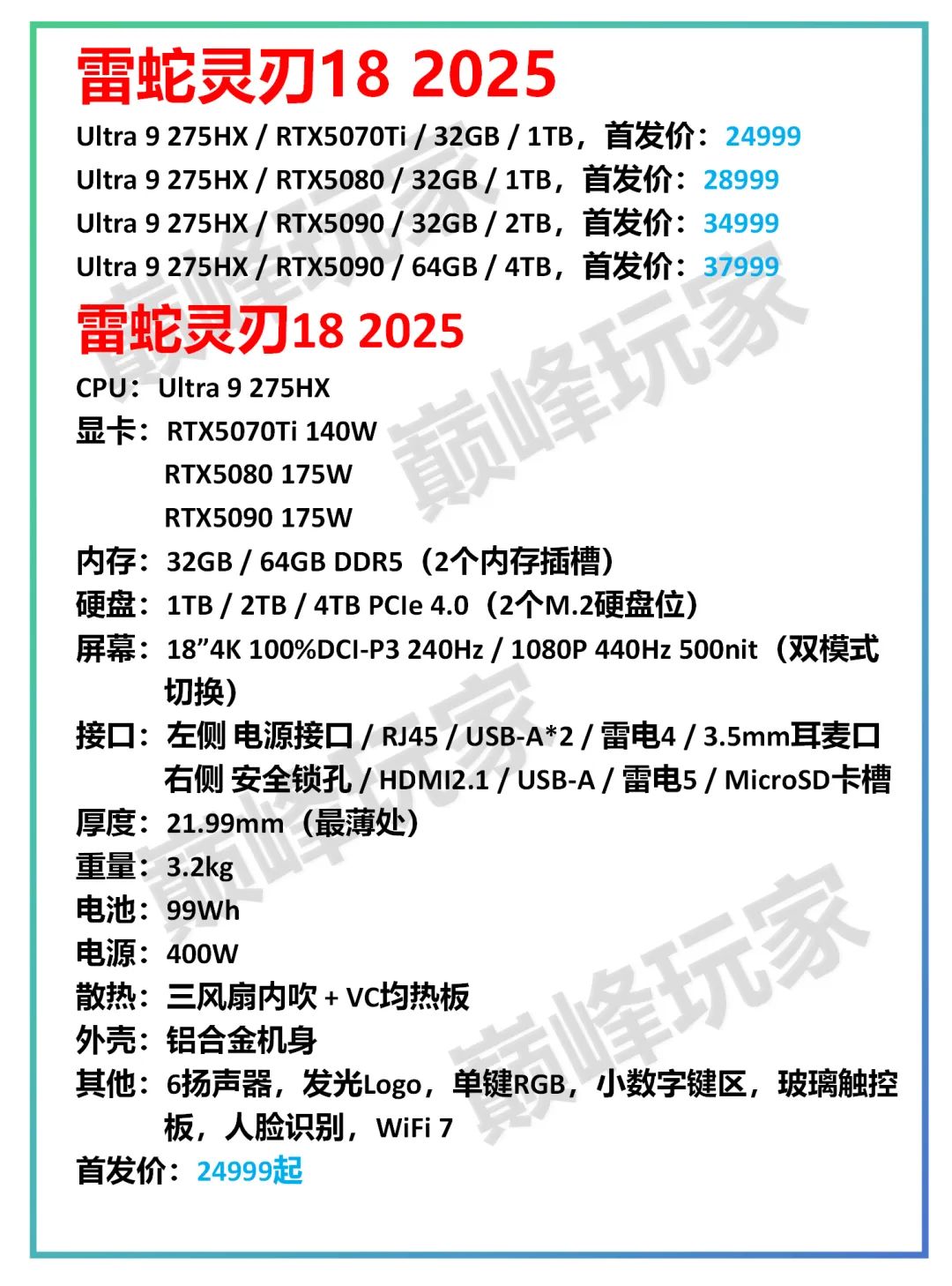 雷蛇已經上架了2025款的靈刃16和靈刃18。全金屬機身,輕薄顏值取向,其中靈刃16已經公佈了5070到5090共計6個不同配置,靈刃18則只有5070Ti到5090共計4個不同配置,模具對比上一代是做了優化改進的。
