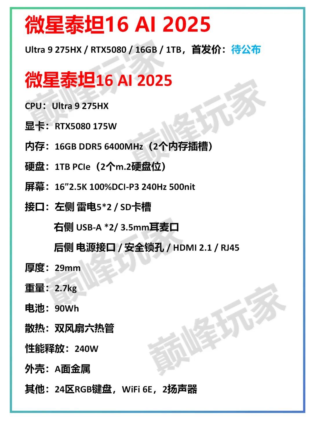 Ultra 9 285HX / RTX5080 / 96GB / 6TB,首發價:待公佈