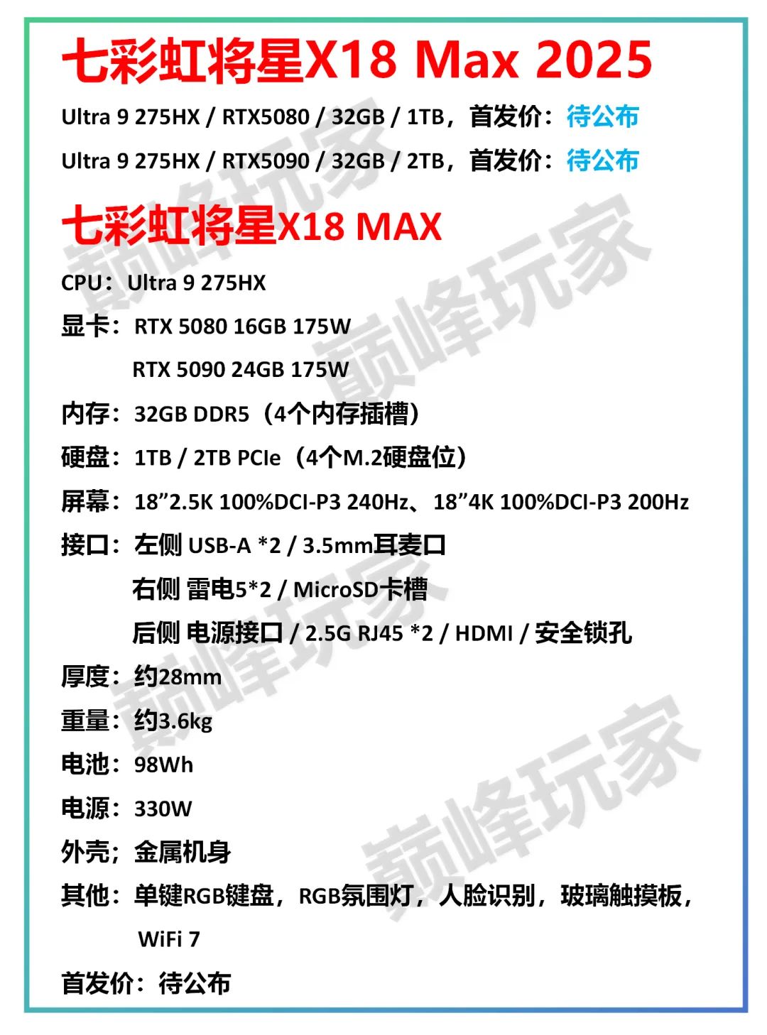 七彩虹已經上架了全新的2025款將星X18 Max旗艦遊戲本,目前推出了RTX5080與RTX5090在內的兩款不同顯卡的配置,現在可以預約,3月31號晚上正式開售,不過價格尚未公佈。詳細配置我也整理好了,你可以參考。