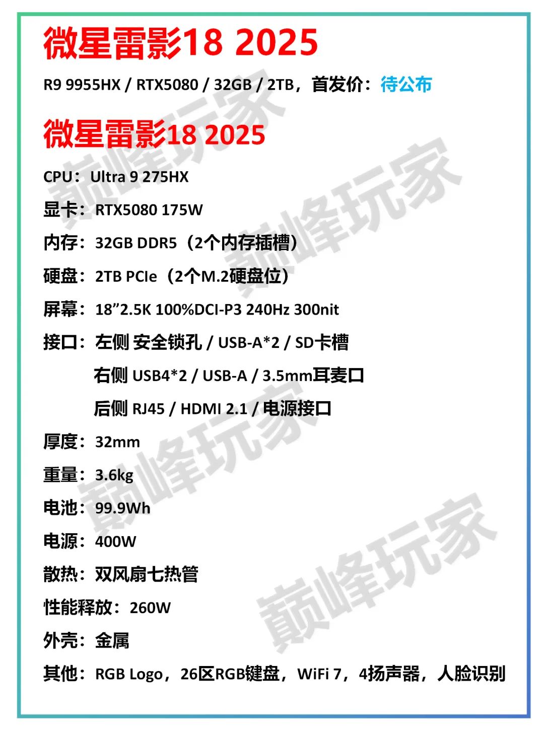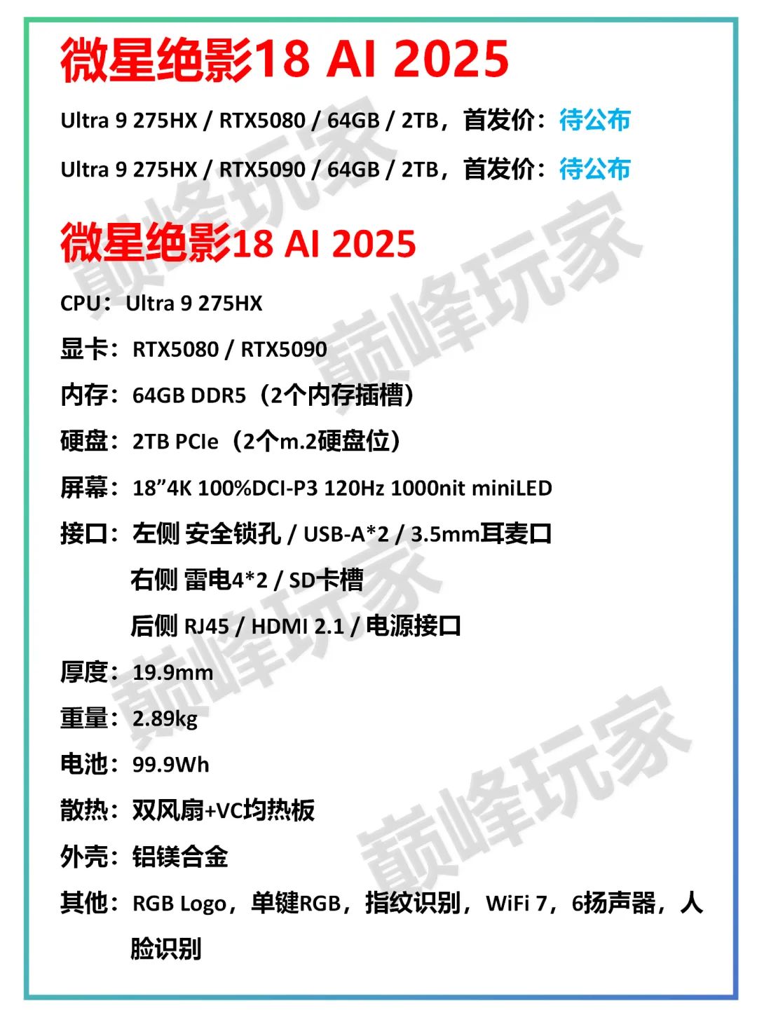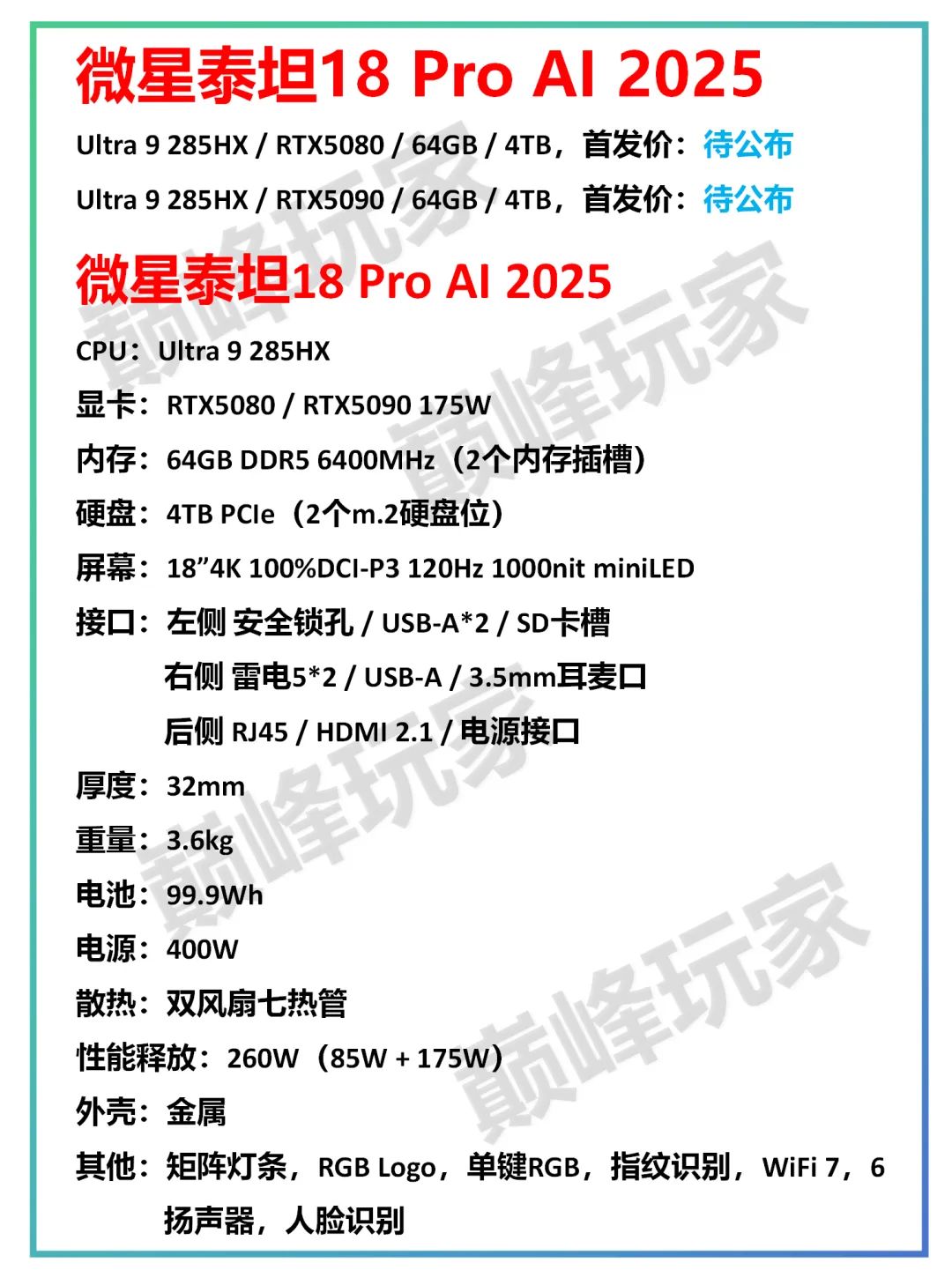 Ultra 9 285HX / RTX5080 / 64GB / 6TB,首發價:待公佈