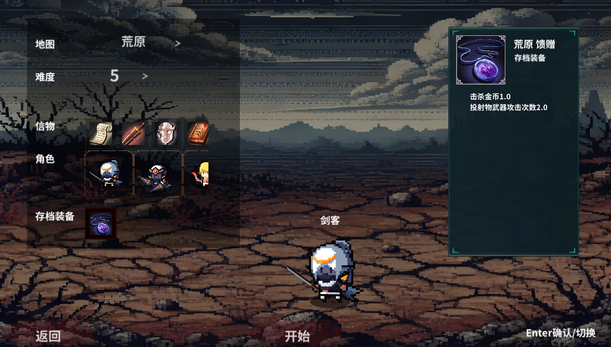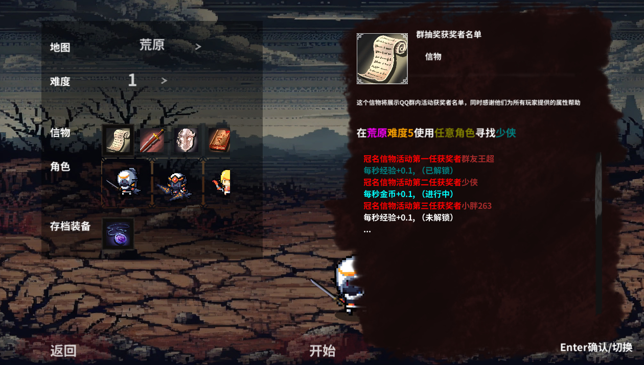 地圖方面,眼下僅有荒原一張,但怪物類型還算多樣。除了固定出現的敵人外,指定難度下也會出現特殊NPC。與它們交互或完成指定任務,可以升級信物,從而在進遊戲之前,便獲得額外的屬性增益。
