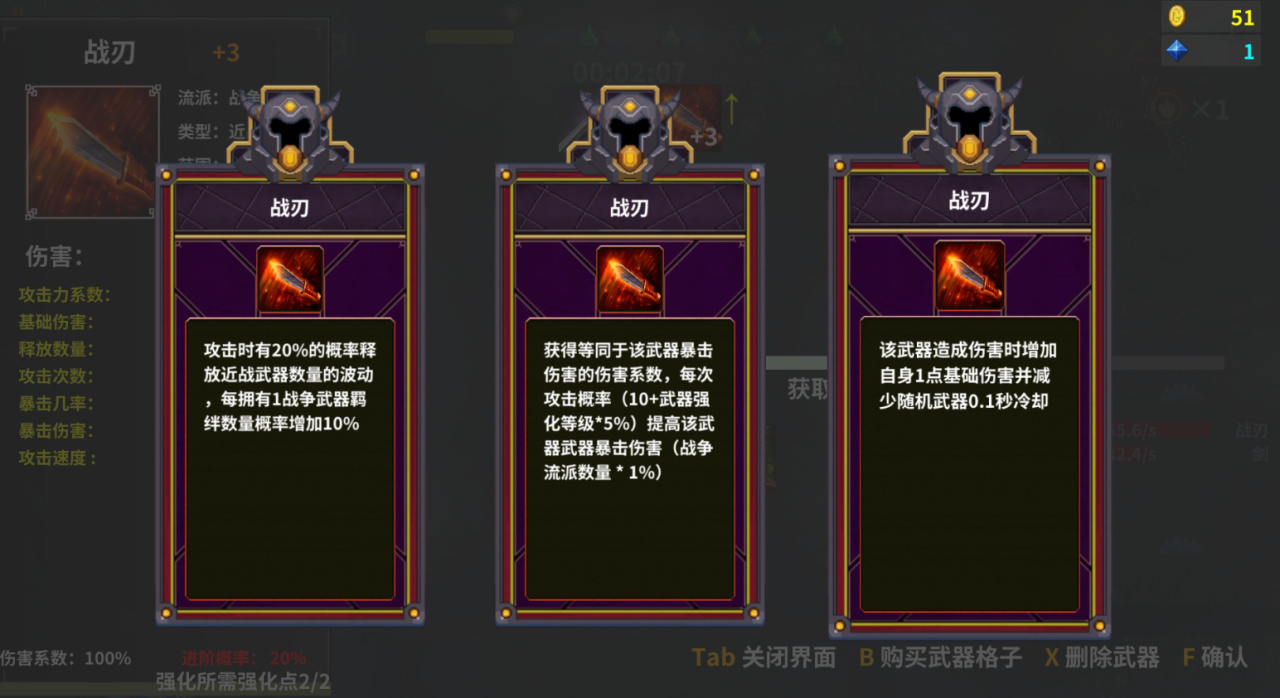 作爲肉鴿核心的基石,《百劍討妖傳綺譚》的局內構築,主要分爲武器強化和自身增益兩個部分。