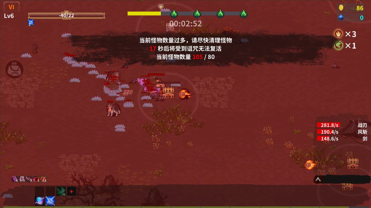 因爲本作,採用了兩段式的玩法:前十分鐘自由發育,且會在血量歸零後的幾秒內自動、無限次復活。如果此時場上怪物超過一定數量,便會失去復活。
