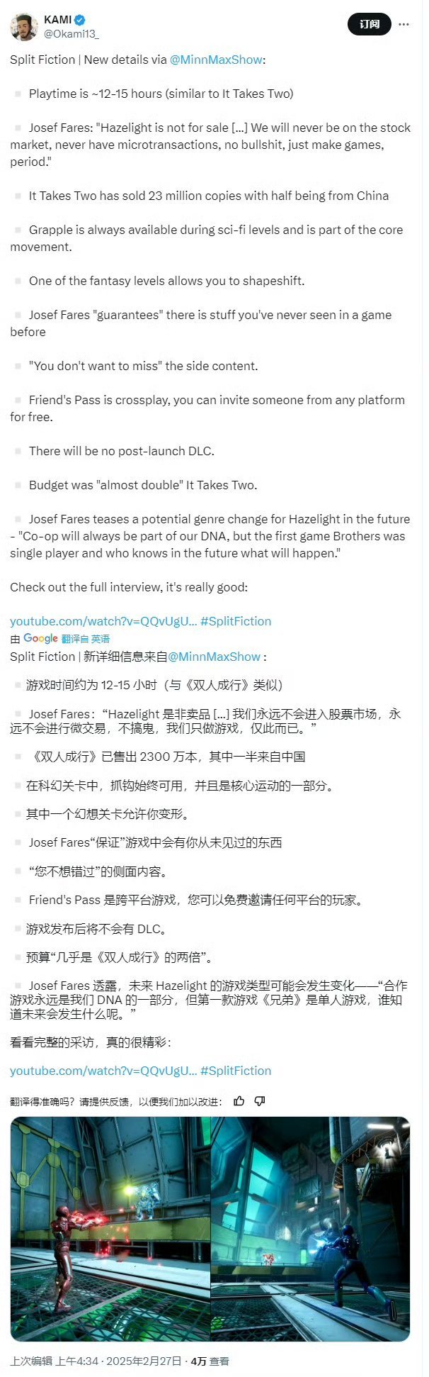 ·本作的預算幾乎是《雙人成行》的兩倍。