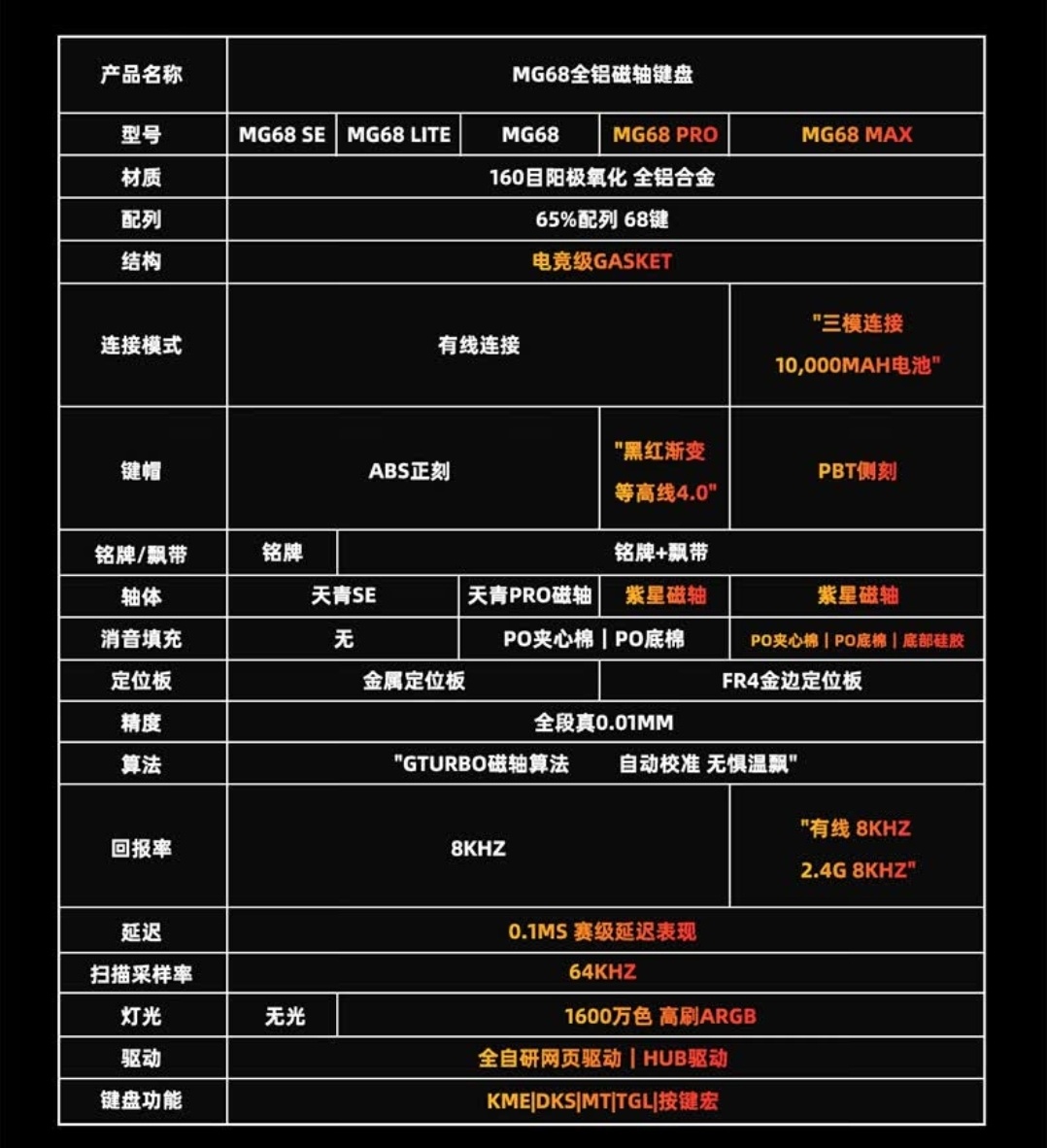 省流:全系:160目陽極氧化全鋁,全段真0.01,8k回報率,0.1ms低延遲,64KHz掃描率,自動校準技術不怕溫漂~99元起