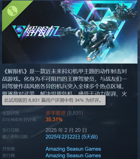 拳打《沙丘》、脚踢《Among us》、顺便把《怪物火车》踩在脚底,我们本应该为《解限机》取得的热度感到欢呼才对——只可惜这次是以反面教材的形式传诵。新品节DEMO榜单前十名里头,它的热度空前绝后,而评价也同样如此:近万的评价、34%的好评率,我只想说一句,还有谁!