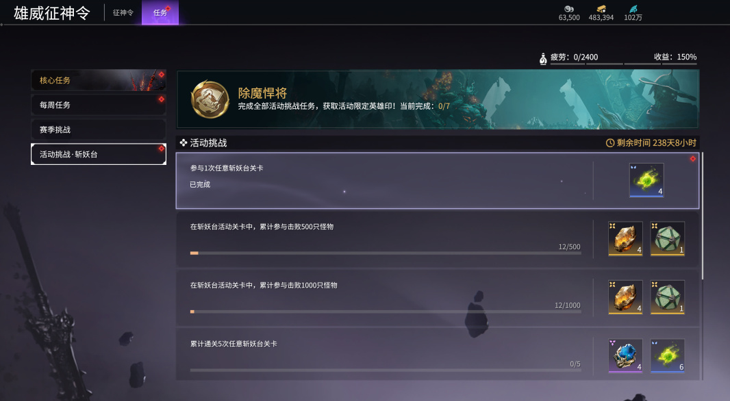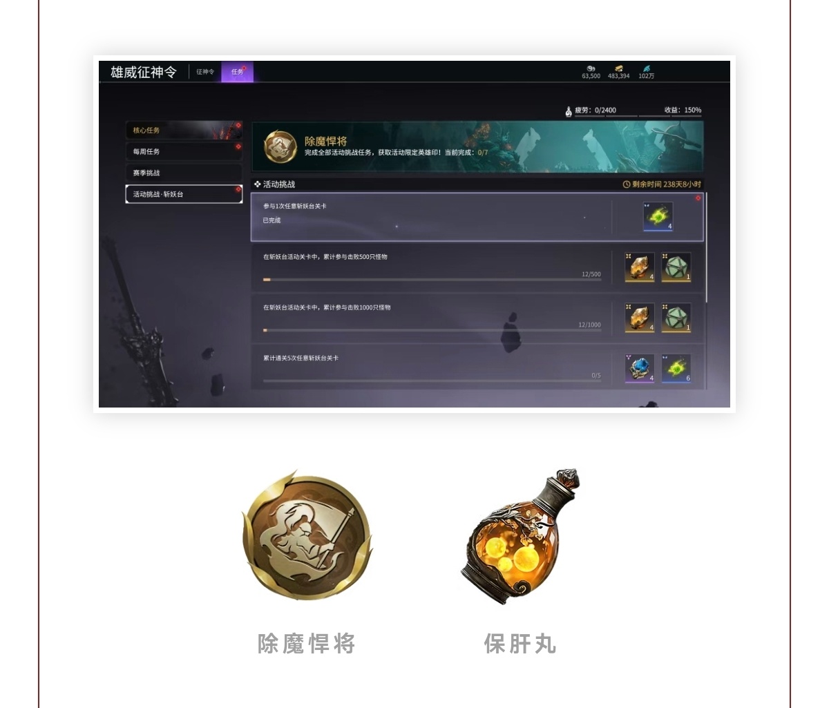 通關成功即可獲得豐厚獎勵,完成全部挑戰任務還可獲得限定英雄印-除魔悍將、保肝丸等獎勵。