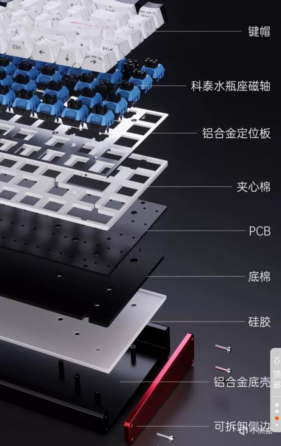 键盘整体为船壳结构,采用了6303铝合金CNC180目阳极氧化工艺,整体摸起来手感很顺滑,并且重量也很压手,大约有2斤左右。左右两侧均做了可拆卸的侧板,拆下侧板时还能看到内部的填充,也是一个小细节了,同时侧板进行了开源,可以制作侧板进行替换,首发购入也有赠送亚克力侧板进行替换,可自定义程度很高。
