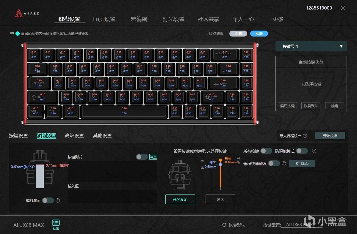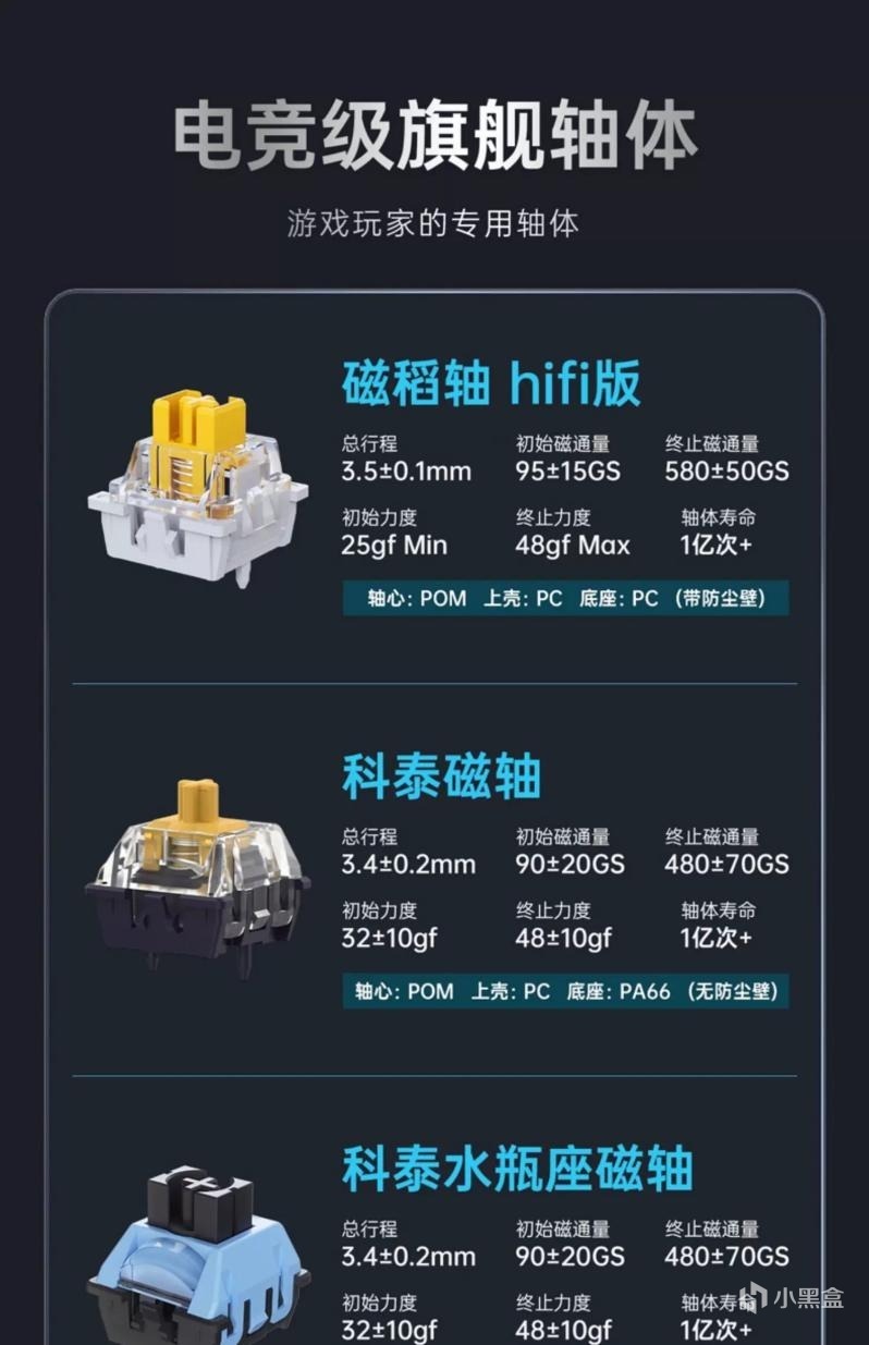 轴体方面,我这把黑爵Alux68采用的是科泰轴,也就是TTC的兄弟品牌科泰与黑爵联合定制的轴体,总行程3.4mm,初始磁通量90GS,终止磁通量480GS,初始力度32gf,终止力度48gf,并且全系支持N极向下的轴体,例如万磁王、磁玉pro等等,自己手中有更强的轴体可以更换上去使用。