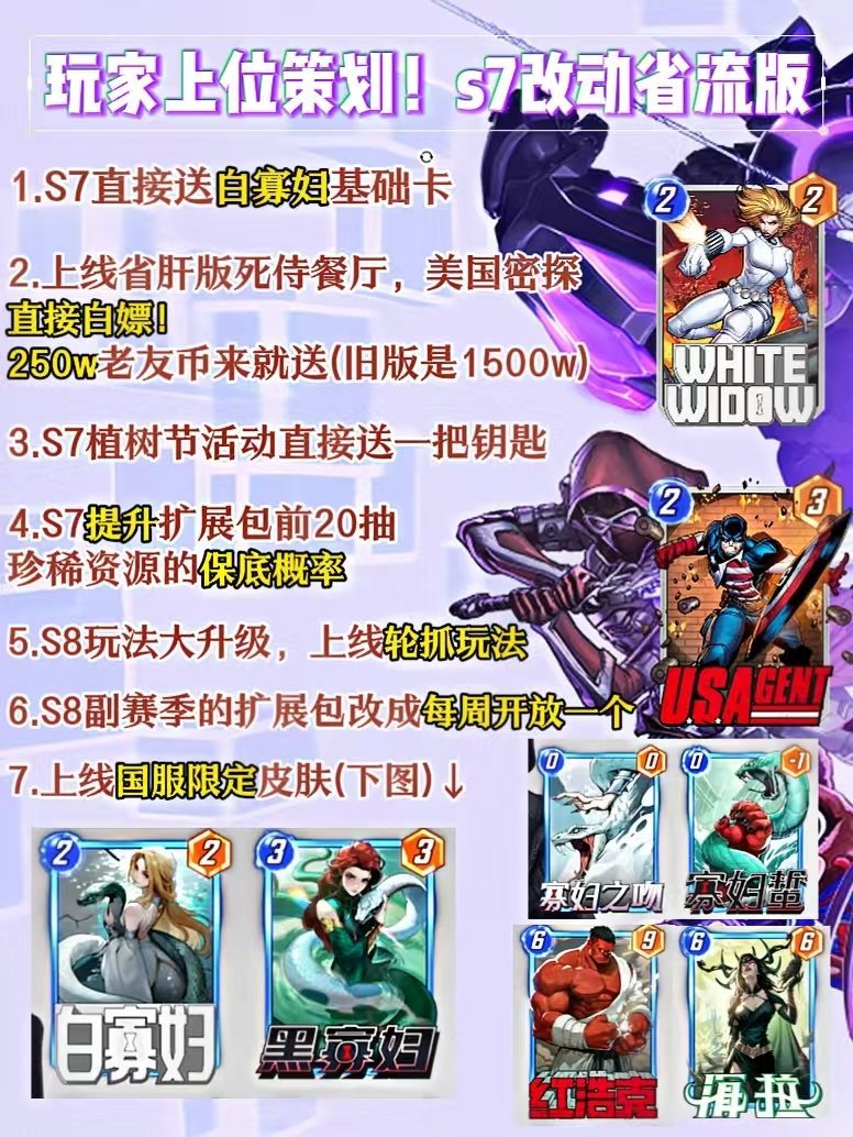 这里也有大佬做的一张视频的福利以及后续更新的省流图片,除了给所有玩家直接免费送的白寡妇之外,当初大热的死侍餐厅活动也会回归,不过这次是大降肝度的版本,比如之前一张新卡就在15M的档次,这次直接是来了个跳水式下跌,只需要2.5M就可以了,甚至“美国密探”这种最新核心卡都直接白给了,果然玩家当上策划之后还是最懂玩家的(不像有些人,当策划连自己的游戏都不玩),这次新上位的“玩家策划”通过一顿爆改真的拿出长线运营的诚意了,snap你这么听劝做什么都会成功~