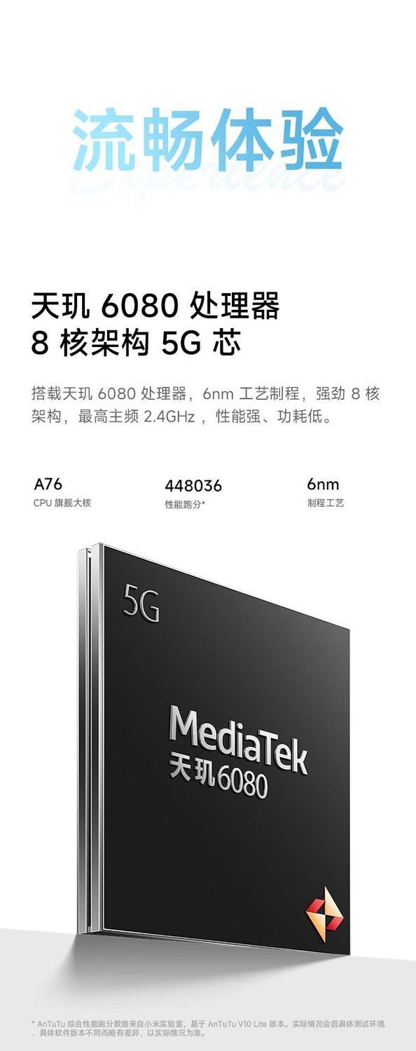 優點:1億後置攝像頭像素、5000毫安時電池、 Oled屏(處理器爲天璣6080)