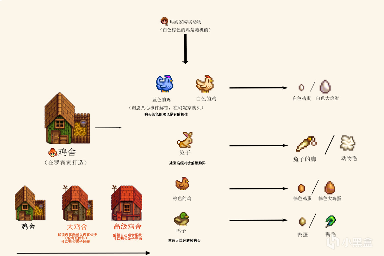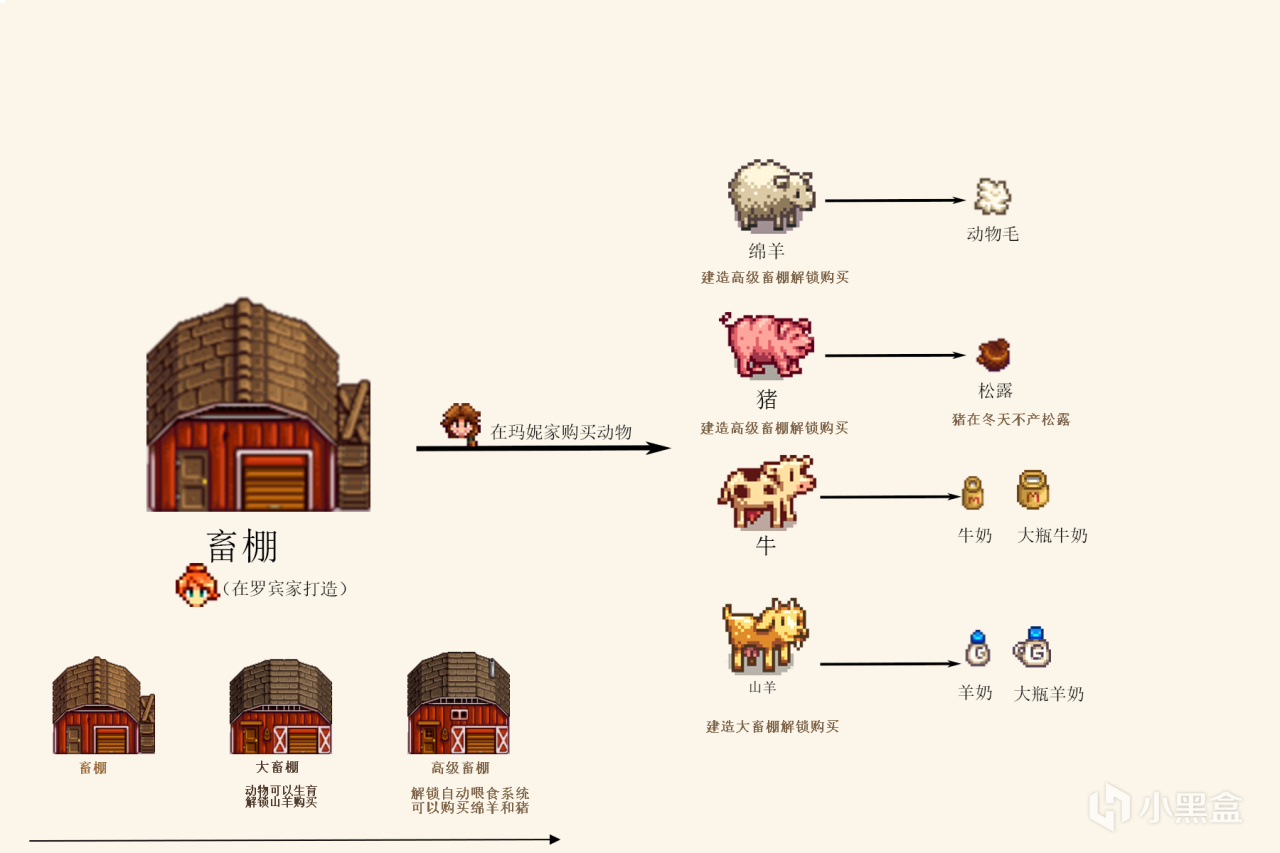 ①养殖动物需要前往罗宾家打造农场建筑,拥有对应建筑后才能在玛妮家解锁购买。